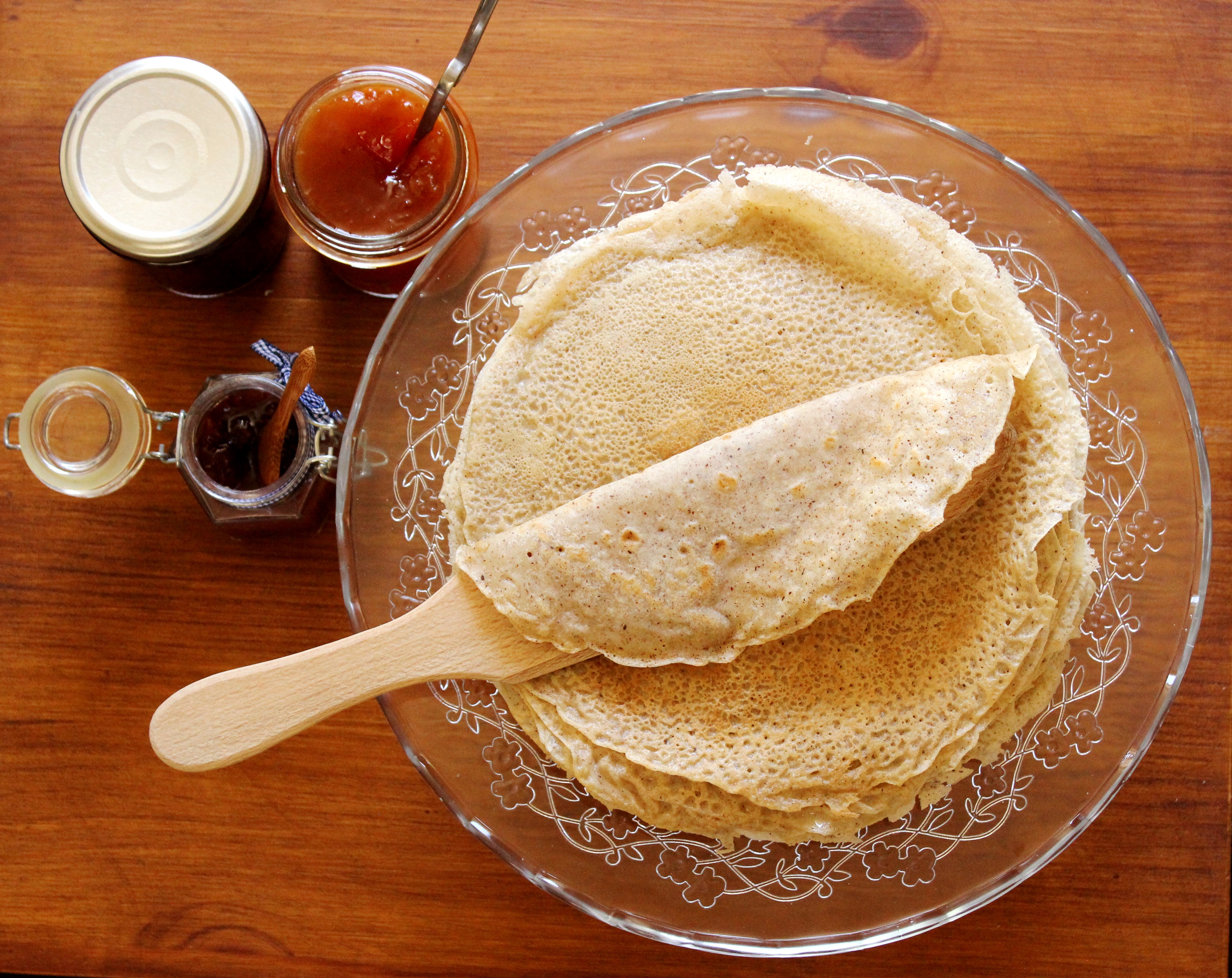 J’y ai ajouté de la farine de sarrasin pour rappeler le goût des galettes bretonnes, ainsi que de la farine de pois chiche pour une bonne tenue et consistance des crêpes, et pour obtenir une couleur plus proche de celles au froment.